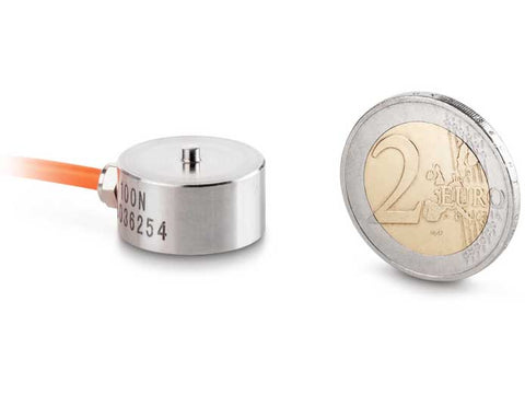 Miniature cylindrical load cell made from stainless steel.