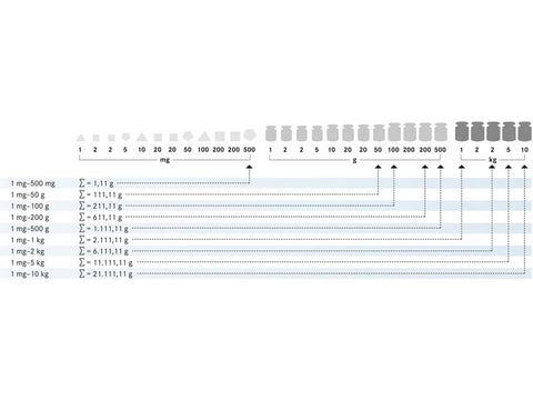 Weight set, M2, 1 g - 5 kg, Knob, stainless steel fine turned, in aluminum case.