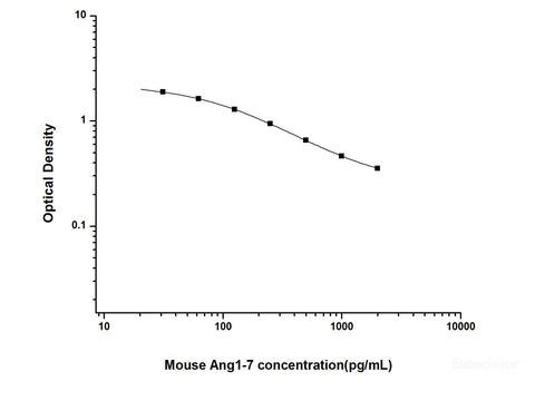 This ELISA kit uses the Competitive-ELISA principle. The micro ELISA plate provided in this kit has been pre-coated with Ang1-7. During the reaction, Ang1-7 in the sample or standard competes with a fixed amount of Ang1-7 on the solid phase supporter for sites on the Biotinylated Detection Ab specific to Ang1-7. Excess conjugate and unbound sample or standard are washed away, and Avidin-Horseradish Peroxidase (HRP) conjugate are added to each micro plate well and incubated. Then a TMB substrate solution is added to each well. The enzyme-substrate reaction is terminated by the addition of stop solution and the color turns from blue to yellow. The optical density (OD) is measured spectrophotometrically at a wavelength of 450 nm ± 2 nm. The concentration of Ang1-7 in tested samples can be calculated by comparing the OD of the samples to the standard curve.