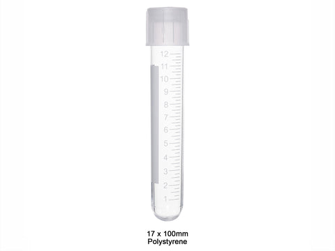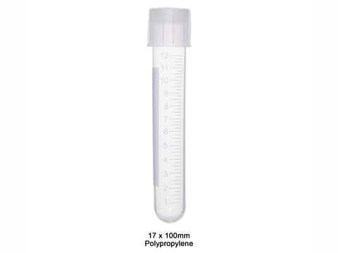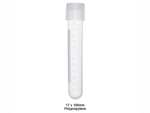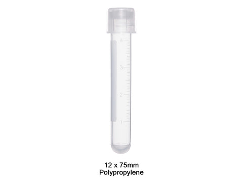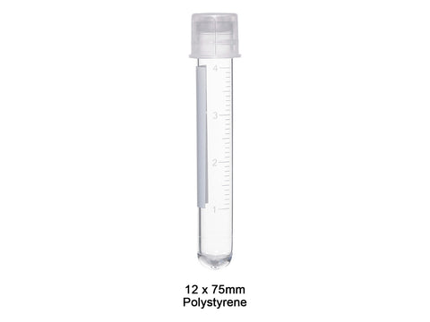 The tubes are available in two plastic polymers. Crystal clear polystyrene (PS) tubes withstand temperatures from 0°C to 70°C, while durable transparent polypropylene (PP) tubes withstand temperatures of from -86°C to 121°C.