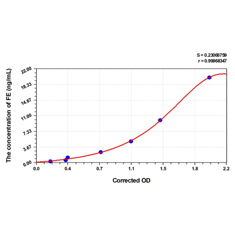 Test principle The test principle applied in this kit is Sandwich enzyme immunoassay. The microtiter plate provided in this kit has been pre-coated with an antibody specific to Human FE, and the Human FE standard plate wells that pre-coated using protein-related techniques are provided separately. Standard/Sample Diluent Buffer or samples are added to the appropriate microtiter plate wells ,then added a HRP-conjugated antibody specific to Human FE. After TMB substrate solution is added, only those wells that contain Human FE and HRP-conjugated antibody will exhibit a change in color. The enzyme-substrate reaction is terminated by the addition of sulphuric acid solution and the color change is measured spectrophotometrically at a wavelength of 450nm ± 10nm. The concentration of Human FE in the samples is then determined by comparing the OD of the samples to the standard curve.
