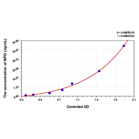 | Test principle | The test principle applied in this kit is Sandwich enzyme immunoassay. The microtiter plate provided in this kit has been pre-coated with an antibody specific to Human MPO, and the Human MPO standard plate wells that pre-coated using protein-related techniques are provided separately. Standard/Sample Diluent Buffer or samples are added to the appropriate microtiter plate wells ,then added a HRP-conjugated antibody specific to Human MPO. After TMB substrate solution is added, only those wells that contain Human MPO and HRP-conjugated antibody will exhibit a change in color. The enzyme-substrate reaction is terminated by the addition of sulphuric acid solution and the color change is measured spectrophotometrically at a wavelength of 450nm ± 10nm. The concentration of Human MPO in the samples is then determined by comparing the OD of the samples to the standard curve. |