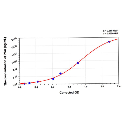 | Test principle | The test principle applied in this kit is Sandwich enzyme immunoassay. The microtiter plate provided in this kit has been pre-coated with an antibody specific to Human PSA, and the Human PSA standard plate wells that pre-coated using protein-related techniques are provided separately. Standard/Sample Diluent Buffer or samples are added to the appropriate microtiter plate wells ,then added a HRP-conjugated antibody specific to Human PSA. After TMB substrate solution is added, only those wells that contain Human PSA and HRP-conjugated antibody will exhibit a change in color. The enzyme-substrate reaction is terminated by the addition of sulphuric acid solution and the color change is measured spectrophotometrically at a wavelength of 450nm ± 10nm. The concentration of Human PSA in the samples is then determined by comparing the OD of the samples to the standard curve. |