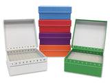MSE PRO FlipTop™ hinged lid boxes are made of recyclable cardboard with a liquid-resistant outer coating. They are shipped fully assembled with 81-place or 100-place cardboard dividers. Each box has drain slots on the bottom surface and numbered grid markings in almost every conceivable location (top, bottom, sides, etc). Available in white and 5 individual colors, plus a “Rainbow Pack” of 5 assorted colors. Useful temperature range: -196° to +121°C.