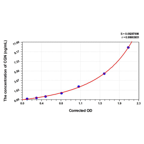| Test principle | The test principle applied in this kit is Sandwich enzyme immunoassay. The microtiter plate provided in this kit has been pre-coated with an antibody specific to Human CGN. Standards or samples are added to the appropriate microtiter plate wells then with a biotin-conjugated antibody specific to Human CGN. Next, Avidin conjugated to Horseradish Peroxidase (HRP) is added to each microplate well and incubated. After TMB substrate solution is added, only those wells that contain Human CGN, biotin-conjugated antibody and enzyme-conjugated Avidin will exhibit a change in color. The enzyme-substrate reaction is terminated by the addition of sulphuric acid solution and the color change is measured spectrophotometrically at a wavelength of 450nm ± 10nm. The concentration of Human CGN in the samples is then determined by comparing the OD of the samples to the standard curve. |