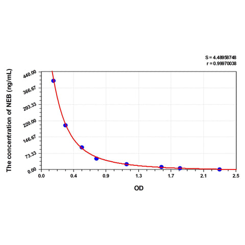 | Test principle | This assay employs the competitive inhibition enzyme immunoassay technique. The microtiter plate provided in this kit has been pre-coated with Human NEB. Standards or samples are added to the appropriate microtiter plate wells then with a biotin-conjugated antibody specific to Human NEB. Next, Avidin conjugated to Horseradish Peroxidase (HRP) is added to each microplate well and incubated. After TMB substrate solution is added. The enzyme-substrate reaction is terminated by the addition of sulphuric acid solution and the color change is measured spectrophotometrically at a wavelength of 450nm ± 10nm. The concentration of Human NEB in the samples is then determined by comparing the OD of the samples to the standard curve. |