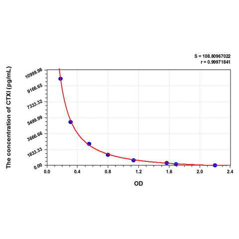 | Test principle | This assay employs the competitive inhibition enzyme immunoassay technique. The microtiter plate provided in this kit has been pre-coated with Mouse CTXI. Standards or samples are added to the appropriate microtiter plate wells then with a biotin-conjugated antibody specific to Mouse CTXI. Next, Avidin conjugated to Horseradish Peroxidase (HRP) is added to each microplate well and incubated. After TMB substrate solution is added. The enzyme-substrate reaction is terminated by the addition of sulphuric acid solution and the color change is measured spectrophotometrically at a wavelength of 450nm ± 10nm. The concentration of Mouse CTXI in the samples is then determined by comparing the OD of the samples to the standard curve. |