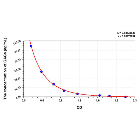Test principle This assay employs the competitive inhibition enzyme immunoassay technique. The microtiter plate provided in this kit has been pre-coated with Mouse GAGs. Standards or samples are added to the appropriate microtiter plate wells then with a biotin-conjugated antibody specific to Mouse GAGs. Next, Avidin conjugated to Horseradish Peroxidase (HRP) is added to each microplate well and incubated. After TMB substrate solution is added. The enzyme-substrate reaction is terminated by the addition of sulphuric acid solution and the color change is measured spectrophotometrically at a wavelength of 450nm ± 10nm. The concentration of Mouse GAGs in the samples is then determined by comparing the OD of the samples to the standard curve.