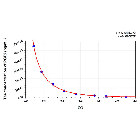 Test principle This assay employs the competitive inhibition enzyme immunoassay technique. The microtiter plate provided in this kit has been pre-coated with PGE2. Standards or samples are added to the appropriate microtiter plate wells then with a biotin-conjugated antibody specific to PGE2. Next, Avidin conjugated to Horseradish Peroxidase (HRP) is added to each microplate well and incubated. After TMB substrate solution is added. The enzyme-substrate reaction is terminated by the addition of sulphuric acid solution and the color change is measured spectrophotometrically at a wavelength of 450nm ± 10nm. The concentration of PGE2 in the samples is then determined by comparing the OD of the samples to the standard curve.