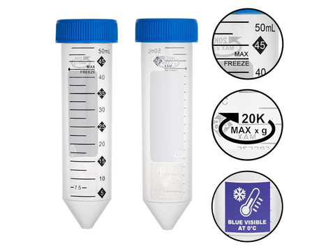 | C2803 | MSE PRO ProSeries™ High Performance Centrifuge Tubes, 50mL, 20,000xg max RCF, sterile, w/ Hi-Viz Graduations and FreezeTech Temperature Indicator Patch, 20 resealable bgs of 25 tubes, 500/cs |