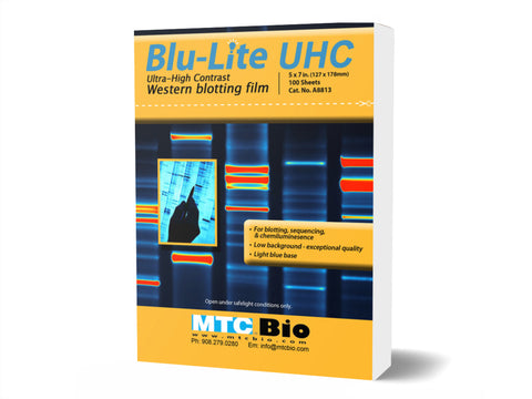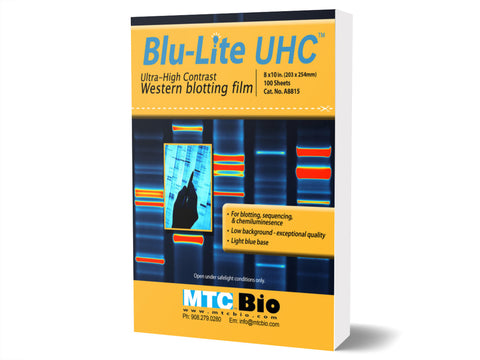 This new film reliably produces sharp images which allow for maximum DNA visualization with unsurpassed clarity. Compatible with automatic processors and manual development methods, Blu-Lite compares directly with films costing 3-5 times as much. With a shelf life of 2 years from the date of production, Blu-Lite UHC™ is packaged in lined, light-safe dispenser boxes that include an improved “lift-off” cover. Film is packaged 100 sheets per box.