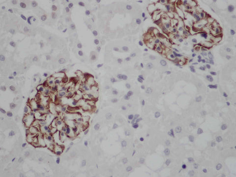 Nestin is a type IV intermediate filament protein expressed by neuroepithelial stem cells and which has been proposed to represent a marker for putative islet stem cells. It is a high molecular weight protein with a terminus greater than 500 residues. Nestins are expressed by several types of cells during development, mostly in dividing cells of the Central Nervous System, Peripheral Nervous System and myogenic tissues. It also represents the progenitor population of neural stem cell origin. The role of nestin in dynamic cells, particularly structural organization of the cell, appears strictly regulated by phosphorylation, especially its integration into heterogeneous intermediate filaments together with vimentin or internexin. Nestin has recently received attention as a marker for detecting newly formed endothelial cells.