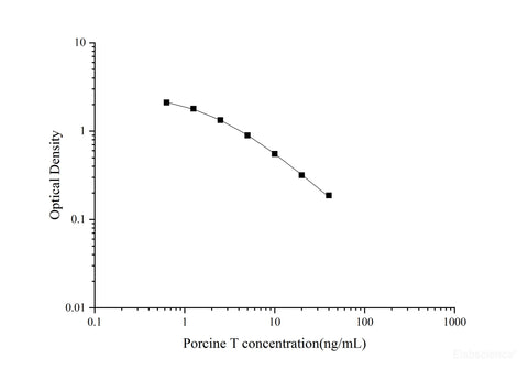This ELISA kit uses the Competitive-ELISA principle. The micro ELISA plate provided in this kit has been pre-coated with Porcine T. Samples (or Standards) and Horseradish Peroxidase (HRP) linked antibody specific for Porcine T are added to the micro ELISA plate wells. Porcine T in samples (or standards) competes with a fixed amount of T on the solid phase supporter for sites on the HRP linked detection antibody specific to T. Excess conjugate and unbound sample or standard are washed from the plate. The substrate solution is added to each well. The enzyme-substrate reaction is terminated by the addition of stop solution and the color turns yellow. The optical density (OD) is measured spectrophotometrically at a wavelength of 450±2 nm. The concentration of Porcine T in the samples is then determined by comparing the OD of the samples to the standard curve.