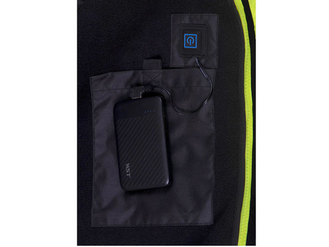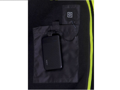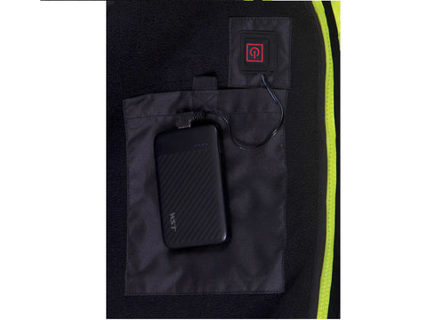 Heated jacket with 3 warming zones; 2 in front and 1 in back.