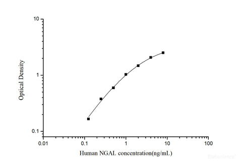 This ELISA kit uses the Sandwich-ELISA principle. The micro ELISA plate provided in this kit has been pre-coated with an antibody specific to Human NGAL. Samples (or Standards) and biotinylated detection antibody specific for Human NGAL are added to the micro ELISA plate wells. Human NGAL would combine with the specific antibody. Then Avidin-Horseradish Peroxidase (HRP) conjugate are added successively to each micro plate well and incubated. Free components are washed away. The substrate solution is added to each well. Only those wells that contain Human NGAL, biotinylated detection antibody and Avidin-HRP conjugate will appear blue in color. The enzyme-substrate reaction is terminated by the addition of stop solution and the color turns yellow. The optical density (OD) is measured spectrophotometrically at a wavelength of 450 ± 2 nm. The OD value is proportional to the concentration of Human NGAL. You can calculate the concentration of Human NGAL in the samples by comparing the OD of the samples to the standard curve.