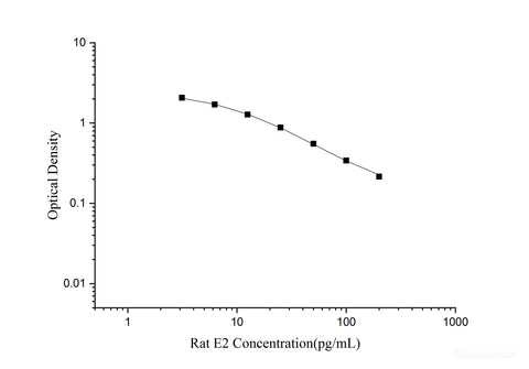 This ELISA kit uses the Competitive-ELISA principle. The micro ELISA plate provided in this kit has been pre-coated with Rat E2. Samples (or Standards) and Horseradish Peroxidase (HRP) linked antibody specific for Rat E2 are added to the micro ELISA plate wells. Rat E2 in samples (or standards) competes with a fixed amount of E2 on the solid phase supporter for sites on the HRP linked detection antibody specific to E2. Excess conjugate and unbound sample or standard are washed from the plate. The substrate solution is added to each well. The enzyme-substrate reaction is terminated by the addition of stop solution and the color turns yellow. The optical density (OD) is measured spectrophotometrically at a wavelength of 450±2 nm. The concentration of Rat E2 in the samples is then determined by comparing the OD of the samples to the standard curve.