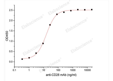 Bio-activity Immobilized Human/Cynomolgus CD28-His at 2μg/ml (100 μl/well) can bind Anti-CD28 mAb. The ED50 of Anti-CD28 mAb is 15.3 ng/ml.