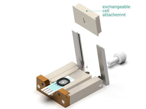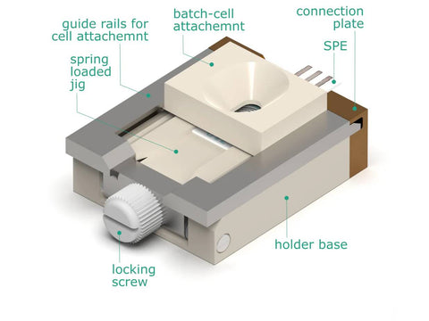 The main function of that tool is the secure and leakproof mounting of the SPE and adapting it to a wide range of cell attachments i.e. static Batch-Cell (included in Screen-Printed Electrode Holder), dynamic Flow-Cell, in situ Raman Cell, UV-Vis spectroscopy cell, and many more coming soon. Other possibilities are available on request through customization service. The holder accommodates SPEs with dimensions ranging from 7 mm to 10.2 mm wide, 0.05 mm to 0.7 mm thick and longer than 20 mm (SPEs are not included in this product). The holder allows quick exchange of the SPE/sensor with easy-to-handle closing system. The SPE/sensor can be easily slipped into the holder where it is securely held in place with spring loaded jig. The Cell Attachment slides in the guide rails, which then is being locked with the connection plate. Additionally, the guide rails with cell attachment can also be secured with thumb screw. The connection plate has two threaded holes (M3, 20 mm spacing) which allow more permanent fixing of cables, batch connection board and other interfacing devices. This connection plate can be customized on request. The default Batch-Cell Attachment has 25 mm2 opening and allows measurements with sample volume up to 450 µL. The O-ring between the cell and the SPE top surface ensures good seal and can be selected from the set included in the holder to level the difference in SPEs thickness.
