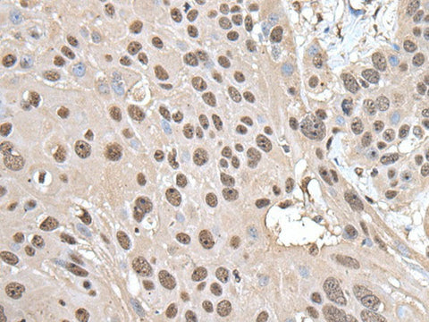 | Cellular Localization | Nucleus. Chromosome. Chromosome>centromere>kinetochore. Associates with chromatin. Before prophase it is scattered along chromosome arms. During prophase, most of cohesin complexes dissociate from chromatin probably because of phosphorylation by PLK, except at centromeres, where cohesin complexes remain. At anaphase, the RAD21 subunit of the cohesin complex is cleaved, leading to the dissociation of the complex from chromosomes, allowing chromosome separation. In germ cells, cohesin complex dissociates from chromatin at prophase I, and may be replaced by a meiosis-specific cohesin complex. The phosphorylated form on Ser-957 and Ser-966 associates with chromatin during G1/S/G2 phases but not during M phase, suggesting that phosphorylation does not regulate cohesin function. Integral component of the functional centromere-kinetochore complex at the kinetochore region during mitosis. |