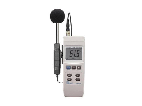 Features AC output and has A and C decibel frequency weighting scales, fast or slow time weighting, hold, peak hold, and min/max functions. Meets IEC 61672:2013 and ANSI S1.4:2014 frequency and time weighting specifications for a Type 2 sound meter. Covers 30 to 130 dB in both manual and auto-ranging scales with 0.1 dB resolution and an accuracy of ±1.0 dB. Certified in compliance with OSHA using an Acoustical Calibrator 850016. Has a fold-out easel back and tripod screw.