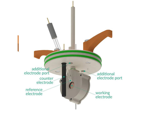 The cell elements are constructed with materials that are inert to the sample (glass and PEEK). It well fits aqueous (EPDM O-Rings) and organic solvent (FFKM O-Rings) electrolyte requirements. The construction is gas-tight and can be used when the removal and exclusion of contaminants such as oxygen and water is required by bubbling of an inert gas through the electrolyte.