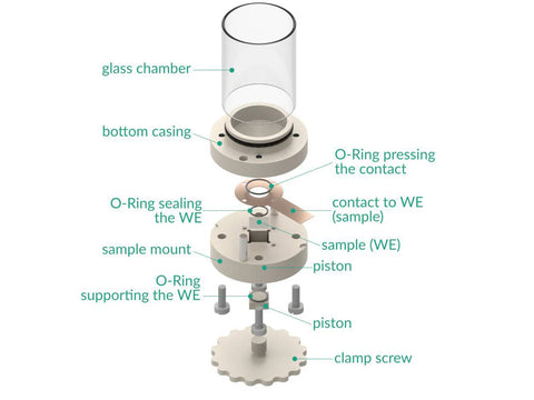 A customization for other substrates sizes/shapes is available on request. The cell elements are constructed with materials that are inert to the sample (glass and PEEK). It well fits aqueous (FKM/EPDM O-Rings) and organic solvent (FFKM O-Rings) electrolyte requirements. The construction is gas-tight and can be used when the removal and exclusion of contaminants such as oxygen and water is required by bubbling of an inert gas through the electrolyte.