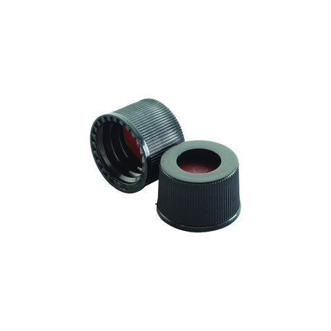 Pre-assembled black polypropylene (PP) screw cap with septa and linerless solid top caps.
