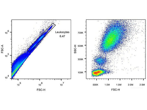 Add 1× lysis solution to the sample for red blood cell lysis. The supernatant was discarded after centrifugation. Cells were analyzed with flow cytometry. Cell debris and platelets can be excluded by a diagonal gate (Left) in the FSC-H vs FSC-A diagram. Lymphocytes, monocytes and granulocytes are separated clearly (Right).