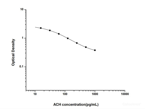 This ELISA kit uses the Competitive-ELISA principle. The micro ELISA plate provided in this kit has been pre-coated with ACH. During the reaction, ACH in the sample or standard competes with a fixed amount of ACH on the solid phase supporter for sites on the Biotinylated Detection Ab specific to ACH. Excess conjugate and unbound sample or standard are washed away, and Avidin-Horseradish Peroxidase (HRP) conjugate are added to each micro plate well and incubated. Then a TMB substrate solution is added to each well. The enzyme-substrate reaction is terminated by the addition of stop solution and the color turns from blue to yellow. The optical density (OD) is measured spectrophotometrically at a wavelength of 450 nm ± 2 nm. The concentration of ACH in tested samples can be calculated by comparing the OD of the samples to the standard curve.