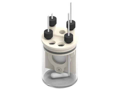 This is a stationary solution double compartment electrochemical H-Cell for measurements of electrodes in a form of: a) rod/disc (6 mm dia.), b) thin film deposited on flat substrate (using a wire clip) and c) membrane (using a wire clip). The working, counter and reference electrodes are mounted in a top casing either in 2-, or 3-electrode setup. The counter electrode is placed in a compartment separated from the other electrodes by ion-exchange membrane (19 mm to 25 mm dia.), so the electrochemical products appearing at working and counter electrode do not affect the opposite electrode. The counter electrode compartment is equipped with a separate inlet and outlet for easy filling with an electrolyte and evacuation of gaseous products. It can accommodate standard Metal Wire Auxiliary Electrode as well as square shape electrodes with sizes up to 25 mm x 25 mm. The cell elements are constructed with materials that are inert to the sample (glass and PEEK). It well fits aqueous (FKM/EPDM O-Rings) and organic solvent (FFKM O-Rings) electrolyte requirements. The construction is gas-tight and can be used when the removal and exclusion of contaminants such as oxygen and water is required by bubbling of an inert gas through the electrolyte. After removal of the counter electrode glass compartment, the cell gets the functionality of a Basic Electrochemical Cell – BEC 50 mL.