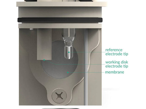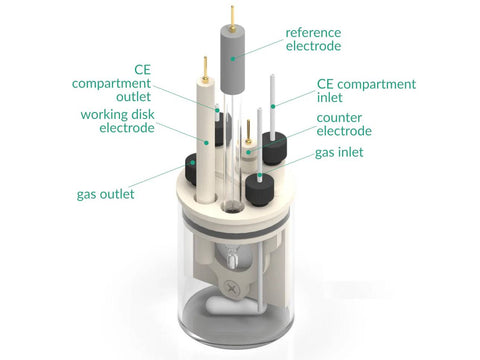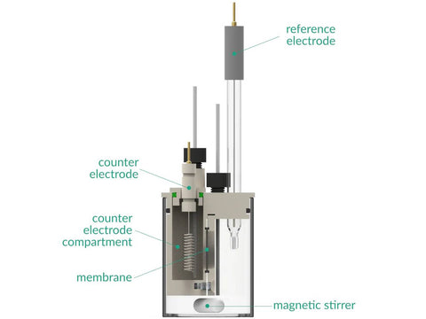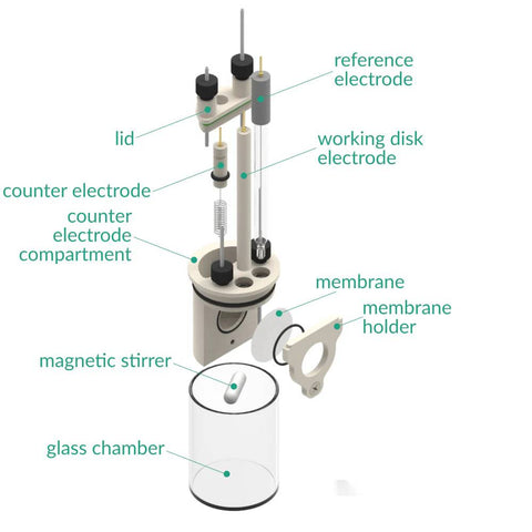 The reference electrode tip and working disk electrode tip should be placed at the middle of the membrane. This will ensure a low potential drop throughout the electrolyte solution for low-current experiment. Various auxiliary electrodes are suitable for this cell including metal wire and metal foil/mesh/foam electrodes as well as graphite rod. The bubbling of gas through the solution must be stopped prior to experiment.