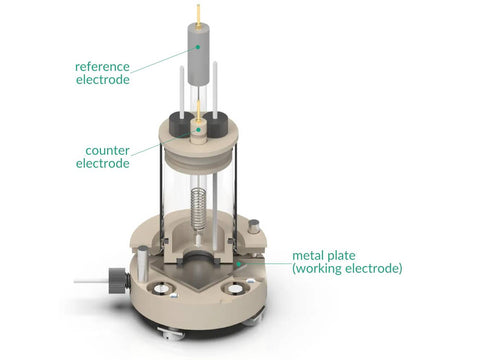 This is a stationary solution corrosion cell for EIS and conventional electrochemical measurements on: (a) thin metal film deposited on flat substrate, (b) metal plate, (c) metal mesh, (d) metal wire and (e) metal ribbon. The sample is installed from the bottom via magnetic or screw mount in between two chambers filled with electrolyte. In cases (a) and (b) bottom chamber is unused and stays dry. The counter or/and reference electrodes are mounted in a top casing (either 2-, or 3-electrode setup). The cell elements are constructed with materials that are inert to the sample (glass and PEEK). It well fits aqueous (FKM/EPDM O-Rings) and organic solvent (FFKM O-Rings) electrolyte requirements. The construction is gas-tight and can be used when the removal and exclusion of contaminants such as oxygen and water is required by bubbling of an inert gas through the electrolyte.