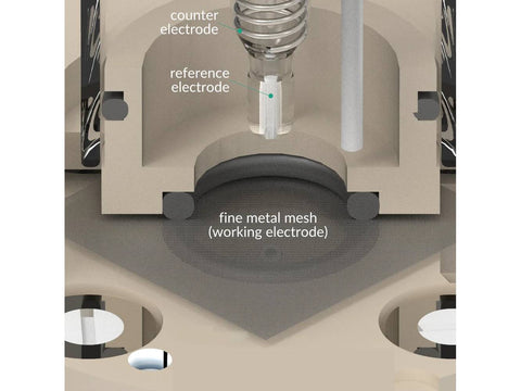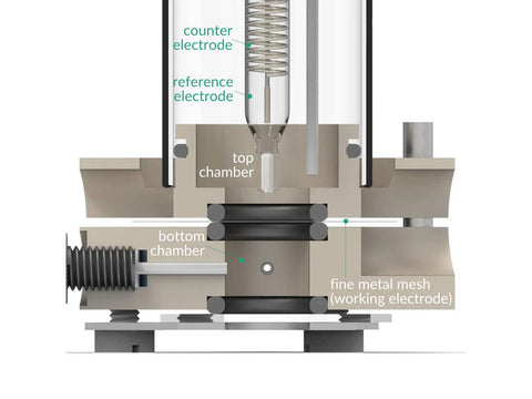 The reference electrode tip should be placed close to the bottom of the chamber (3-5 mm), where the working electrode is exposed to the electrolyte. This will ensure a negligible potential drop throughout the electrolyte solution for low-current experiment. Various auxiliary electrodes are suitable for this cell including noble metal wire and graphite rod. The bubbling of gas through the solution must be stopped prior to experiment.
