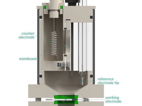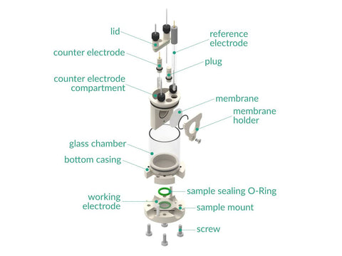 The cell elements are constructed with materials that are inert to the sample (glass and PEEK). It well fits aqueous (FKM/EPDM O-Rings) and organic solvent (FFKM O-Rings) electrolyte requirements. The construction is gas-tight and can be used when the removal and exclusion of contaminants such as oxygen and water is required by bubbling of an inert gas through the electrolyte.