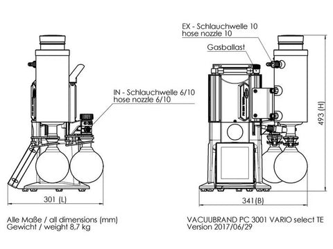 The PC 3001 VARIO select pumping unit precisely controls the vacuum level in order to achieve unparalleled process control. This pump is suitable for even high boiling point solvents. The integrated VACUU·SELECT controller provides an easy-to-use, application based interface that covers all common lab applications. The VACUU·SELECT controller has you covered. Use manual set-point-control for simple processes, run fully automated distillations, or create your own application with simple drag-and-drop editing. For solvent evaporation, the VACUU·SELECT controller detects solvent boiling and automatically adjusts the pump's motor speed to maintain process control. The VARIO motor speed control also makes the pump whisper quiet and provides for exceptionally long maintenance intervals. The inlet separator, made of glass with a robust protective coating, prevents particles and liquid droplets from entering the pump, preventing damage and extending pump life. The PC 3001 VARIO select TE is equiped with a dry ice condenser at the pump exhaust, so that no cooling water connection is required.
