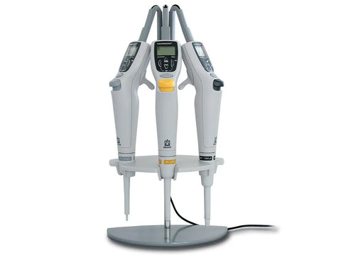 - Three Transferpette® electronic pipettes (single channel, up to 1000 μl) can be charged simultaneously in the charging stand. Individual power supplies no longer needed!