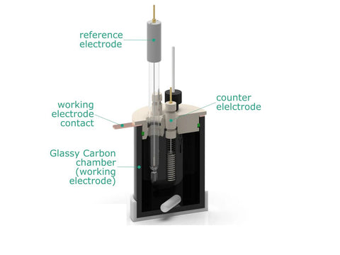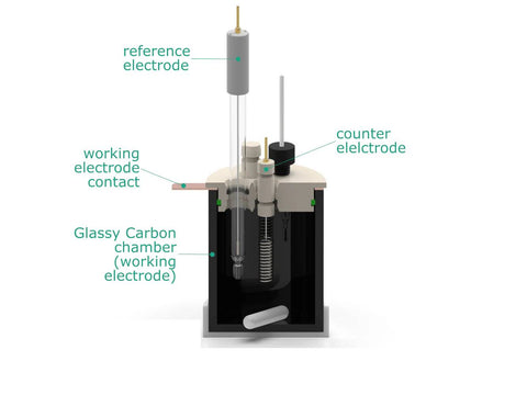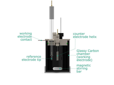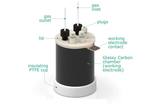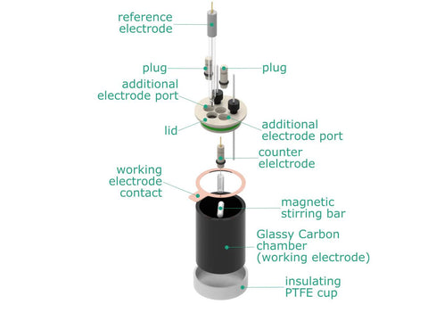 This is a single compartment bulk electrolysis cell (known also as potentiostatic coulometry cell or controlled potential coulometry cell). In this innovative cell concept, the cell vessel made of Glassy Carbon contains studied liquid and acts as a working electrode at the same time. The electrical connection to this electrode is made by 0.75 mm thick Copper ring pressed to the Glassy Carbon chamber by the lid. The counter electrode (typically Platinum wire or Platinum gauze electrode) and reference electrode (typically Ag/AgCl for aqueous electrolytes or Ag/Ag+ for organic media) are installed in the cell lid. Both counter and reference electrodes are not included in the cell and should be added to the quotation separately. Glassy Carbon working electrode provides a large flat surface area which is easy to clean (chemically and mechanically). This unique electrode arrangement and possibility to use magnetic stirring ensure very efficient mass transport conditions and multiple use. The cell is insulated from the bottom by PTFE cup and can be placed on a metallic surface such as stirring plate or hot plate. The cell elements are constructed with materials that are inert to the sample (PEEK and PTFE). It well fits aqueous (FKM/EPDM O-Rings) and organic solvent (FFKM O-Rings) electrolyte requirements. The construction is liquid- and gas-tight.