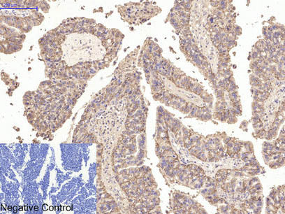Carbonic anhydrases (CAs) are a large family of zinc metalloenzymes that catalyze the reversible hydration of carbon dioxide. They participate in a variety of biological processes, including respiration, calcification, acid-base balance, bone resorption, and the formation of aqueous humor, cerebrospinal fluid, saliva, and gastric acid. They show extensive diversity in tissue distribution and in their subcellular localization. CA IX is a transmembrane protein and the only tumor-associated carbonic anhydrase isoenzyme known. It is expressed in all clear-cell renal cell carcinoma, but is not detected in normal kidney or most other normal tissues. It may be involved in cell proliferation and transformation.