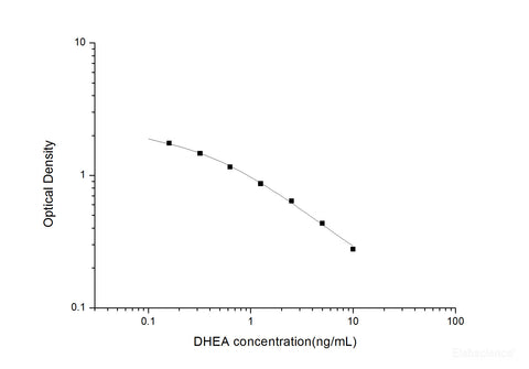 This ELISA kit uses the Competitive-ELISA principle. The micro ELISA plate provided in this kit has been pre-coated with DHEA. During the reaction, DHEA in the sample or standard competes with a fixed amount of DHEA on the solid phase supporter for sites on the Biotinylated Detection Ab specific to DHEA. Excess conjugate and unbound sample or standard are washed away, and Avidin-Horseradish Peroxidase (HRP) conjugate are added to each micro plate well and incubated. Then a TMB substrate solution is added to each well. The enzyme-substrate reaction is terminated by the addition of stop solution and the color turns from blue to yellow. The optical density (OD) is measured spectrophotometrically at a wavelength of 450 nm ± 2 nm. The concentration of DHEA in tested samples can be calculated by comparing the OD of the samples to the standard curve.