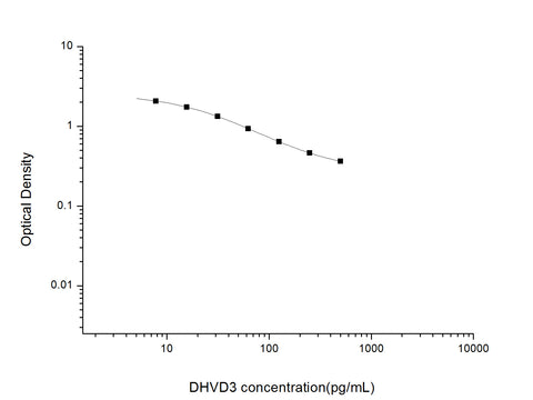 This ELISA kit uses the Competitive-ELISA principle. The micro ELISA plate provided in this kit has been pre-coated with Universal DHVD3. During the reaction, Universal DHVD3 in the sample or standard competes with a fixed amount of Universal DHVD3 on the solid phase supporter for sites on the Biotinylated Detection Ab specific to Universal DHVD3. Excess conjugate and unbound sample or standard are washed away, and Avidin-Horseradish Peroxidase (HRP) conjugate are added to each micro plate well and incubated. Then a TMB substrate solution is added to each well. The enzyme-substrate reaction is terminated by the addition of stop solution and the color turns from blue to yellow. The optical density (OD) is measured spectrophotometrically at a wavelength of 450 nm ± 2 nm. The concentration of Universal DHVD3 in tested samples can be calculated by comparing the OD of the samples to the standard curve.