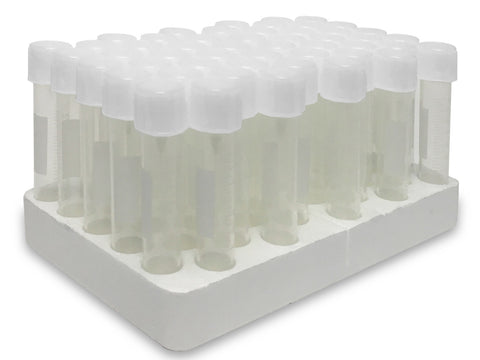 | T8742 | Culture Tube, 5mL, 12 x 75mm, PS, w/ attached 2-position screw-cap, printed graduations, sterile, 10 foam racks of 50 tubes, 500/case |