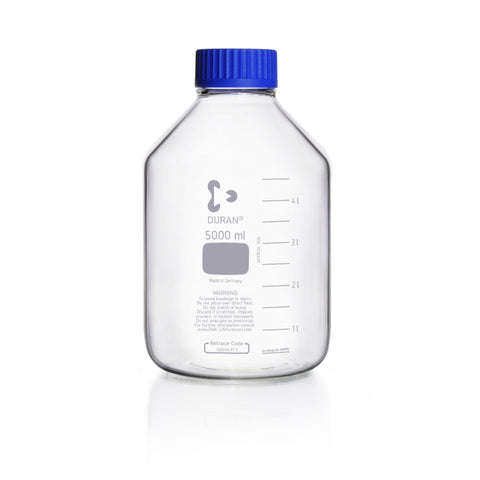 DURAN® wide mouth GLS 80® laboratory bottles are moulded from high-purity, clear, USP/EP Type I borosilicate glass 3.3, renowned for its excellent thermal performance, and high resistance to chemical attack. A combination of high-performance materials and robust ISO 4796-1 design provides a long working life. The bottles feature an easy-to-read graduated volume scale, and marking field in permanent white enamel. Permanent Retrace Code on each bottle for manufacturing lot traceability. DURAN® wide mouth GLS 80® are supplied complete with blue polypropylene cap and drip-free pouring ring for use up to 140 °C. All components are fully autoclavable at 121 or 134 °C.