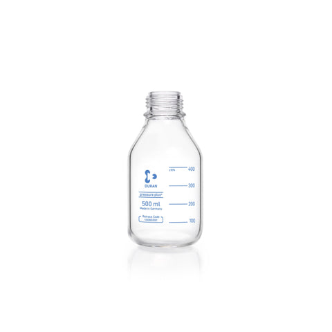 The DURAN® pressure plus+ GL 45 protect+ coated bottles offer a safer option for laboratory applications involving a vacuum or pressure. Standard glass laboratory bottles are not designed to safely withstand pressure differentials. As a result of a modified geometry, the pressure plus+ bottles have a guaranteed pressure-resistance, and consequently offer optimal safety for both the user and contents. The special geometry still conforms to ISO 4796-1:2016 to maintain instrument compatibility. The pressure plus+ bottles are certified in accordance with DIN EN 1595. The bottles are moulded from high-purity, clear, USP/EP Type I borosilicate glass 3.3, renowned for its excellent thermal performance, and high resistance to chemical attack. The glass is coated with a clear polyamide PA12 plastic coating that offers protection for the user and contents in the event of breakage due to impact. The bottles feature an easy-to-read graduated volume scale printed in a distinctive blue enamel. Permanent Retrace Code on each bottle for manufacturing lot traceability.