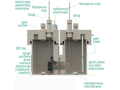 In this reactor, a solid anode (positive) and cathode (negative) are installed in Tantalum clips. If a 3-electrode setup is required, the reference electrode is mounted in the working electrode compartment. Such electrode assembly is introduced into a solution containing the substrate and a supporting electrolyte, in order to carry the current through the cell separated by the membrane.