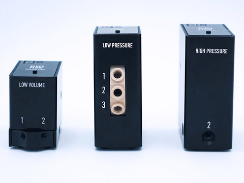 Three microfluidic valve models are available. The valve model relates to the supported pressure – high pressure (until 6 bars), low pressure (until 3 bars), and low volume (for low internal volume requirements).