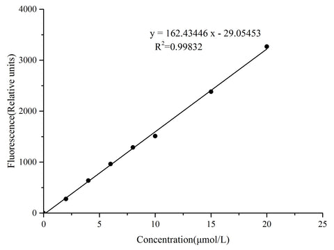 As the fluorescence value of the standard curve may vary according to the conditions of the actual assay performance (e.g. operator, pipetting technique or temperature effects), so the standard curve and data are provided as below for reference only: