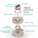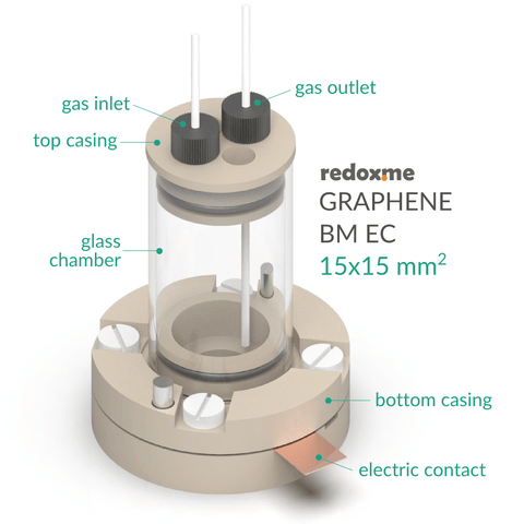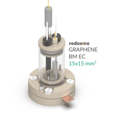 This is a stationary solution voltammetry cell for measurements of the 15x15 mm2 sample. The sample is loaded from the bottom via classical screw mount, while counter or/and reference electrodes are mounted in a top casing (either 2-, or 3-electrode setup). The cell elements are constructed with materials that are inert to the sample (glass and PEEK). It well fits aqueous (EPDM O-Rings) and organic solvent (FFKM O-Rings) electrolyte requirements. The construction is gas-tight and can be used when the removal and exclusion of contaminants such as oxygen and water is required by bubbling of an inert gas through the electrolyte.