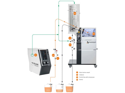 You can enter the parameters for the sensor- or time-controlled filling of the rotary flask via the removable 7“ touchscreen control panel. The emptying times of the coated collector vessel with condensate cooling (approx. 1 l) and the residue from the rotary flask by the compressor can also be programmed here. In addition, you can start the automatic cleaning mode and manual operation. The tower with the integrated compressor of the Hei-VOLUME Distimatic 24/7 can be mounted directly with all components on a Hei-VAP Industrial large-scale rotary evaporator using the bracket supplied.