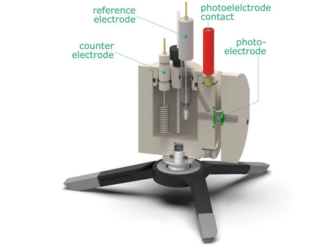 A thin film of interest deposited on a transparent glass or plastic foil is installed in the hook clamp assembled mount facing the cell chamber. In 2-electrode setup, the counter electrode is placed in the socket close to the working electrode while the remaining socket is plugged. When 3-electrode setup is required, the reference electrode is placed close to the measured sample to limit the effect of electrolyte resistance, while the counter electrode occupies the remaining socket. Various auxiliary electrodes are suitable for this cell including metal wire, gauze and foil electrodes as well as non-metal electrodes. Typical applications include: basic photochemistry, photolytic water splitting, CO2 reduction, photoinduced charge separation and photocorrosion.