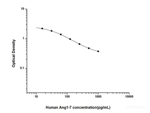 This ELISA kit uses the Competitive-ELISA principle. The micro ELISA plate provided in this kit has been pre-coated with Ang1-7. During the reaction, Ang1-7 in the sample or standard competes with a fixed amount of Ang1-7 on the solid phase supporter for sites on the Biotinylated Detection Ab specific to Ang1-7. Excess conjugate and unbound sample or standard are washed away, and Avidin-Horseradish Peroxidase (HRP) conjugate are added to each micro plate well and incubated. Then a TMB substrate solution is added to each well. The enzyme-substrate reaction is terminated by the addition of stop solution and the color turns from blue to yellow. The optical density (OD) is measured spectrophotometrically at a wavelength of 450 nm ± 2 nm. The concentration of Ang1-7 in tested samples can be calculated by comparing the OD of the samples to the standard curve.